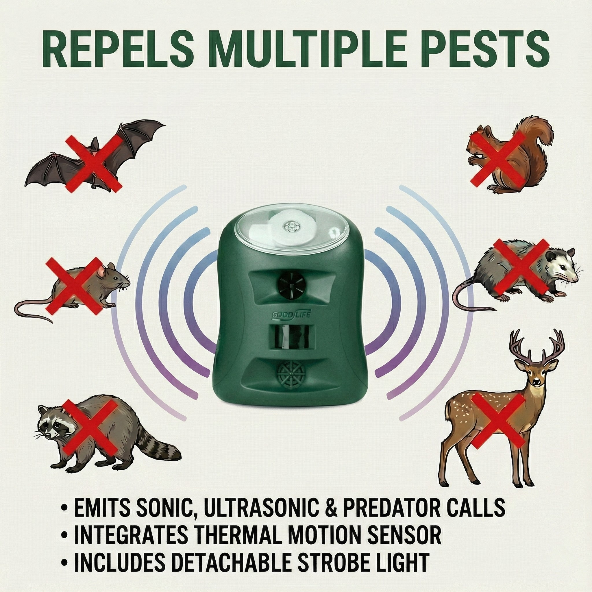 The Guardian combines sonic and ultrasonic sounds, predator calls and a thermal motion sensor to detect unwanted pests and drive them out. Use it indoors or outdoors to repel bats, cats, mice, rats, rodents, skunks, squirrels, raccoons, possums, deer, and other animal pests.
